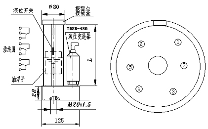 報(bào)警點(diǎn)接線盒:端子1、2為上限,液位高于上限時(shí)斷開(kāi),低于上限時(shí)閉合;端子3、4為中點(diǎn),液位高于中點(diǎn)時(shí)斷開(kāi),低于中點(diǎn)時(shí)閉合;端子5、6為下限,液位低于下限時(shí)閉合,高于下限時(shí)斷開(kāi)。