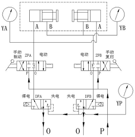 、旋轉(zhuǎn)電磁閥1上的手動(dòng)旋鈕(順時(shí)針),壓力氣體P經(jīng)過(guò)電磁閥1從工作腔A供出,實(shí)現(xiàn)手動(dòng)制動(dòng);制動(dòng)完畢后逆時(shí)針旋回旋鈕,排出制動(dòng)腔氣體。