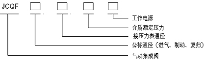 1JCQF-10-8-0.8-DC220表示氣制動(dòng)集成閥的公稱通徑為10mm,到壓力表的管內(nèi)徑為8mm,介質(zhì)額定壓力為0.8MPa,工作電源為直流DC220