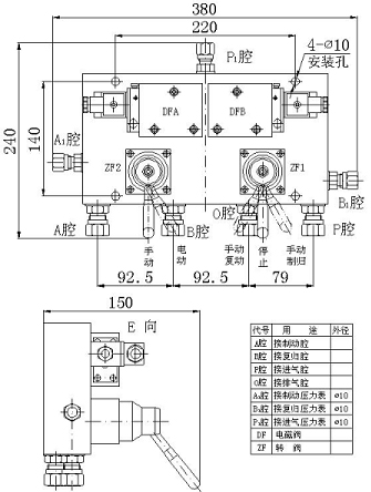 1、自動回路:將手動轉閥ZF1的手柄扳到停止位置,手動轉閥ZF2的手柄扳到電動位置,壓縮空氣進入電磁換向閥DFA、DFB的壓力腔(進氣腔),并密封在壓力腔內,左、右工作腔與排氣腔接通。